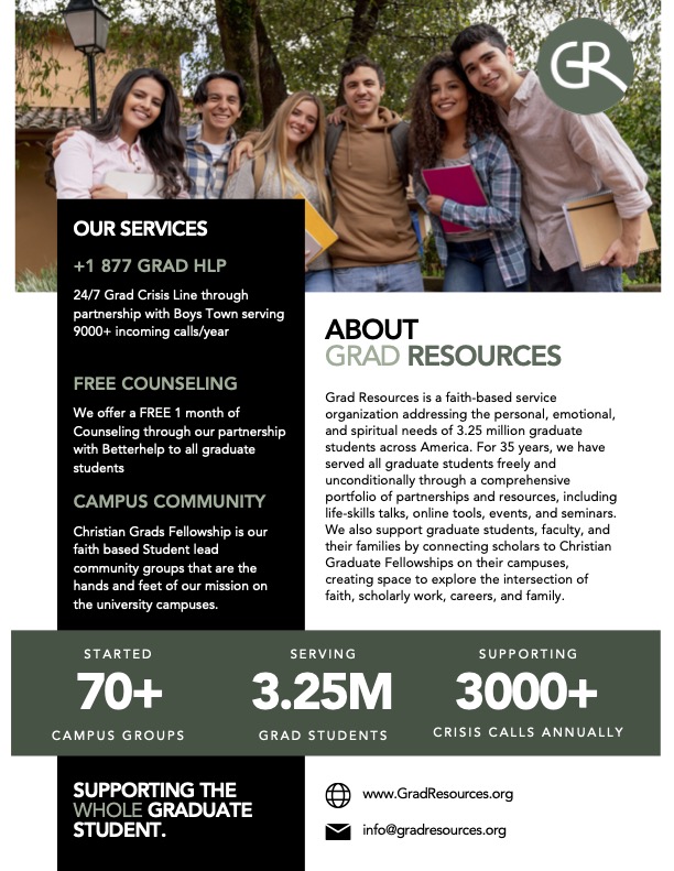 Today, Grad Resources is active and thriving, expanding our tools to address the struggles of graduate students and providing supportive faith-based communities. The National Grad Crisis Line continues to receive calls every month from graduate students looking for emotional support. Our advice and counsel continue to be requested by dean’s offices and press outlets while students readily consult our online resources.